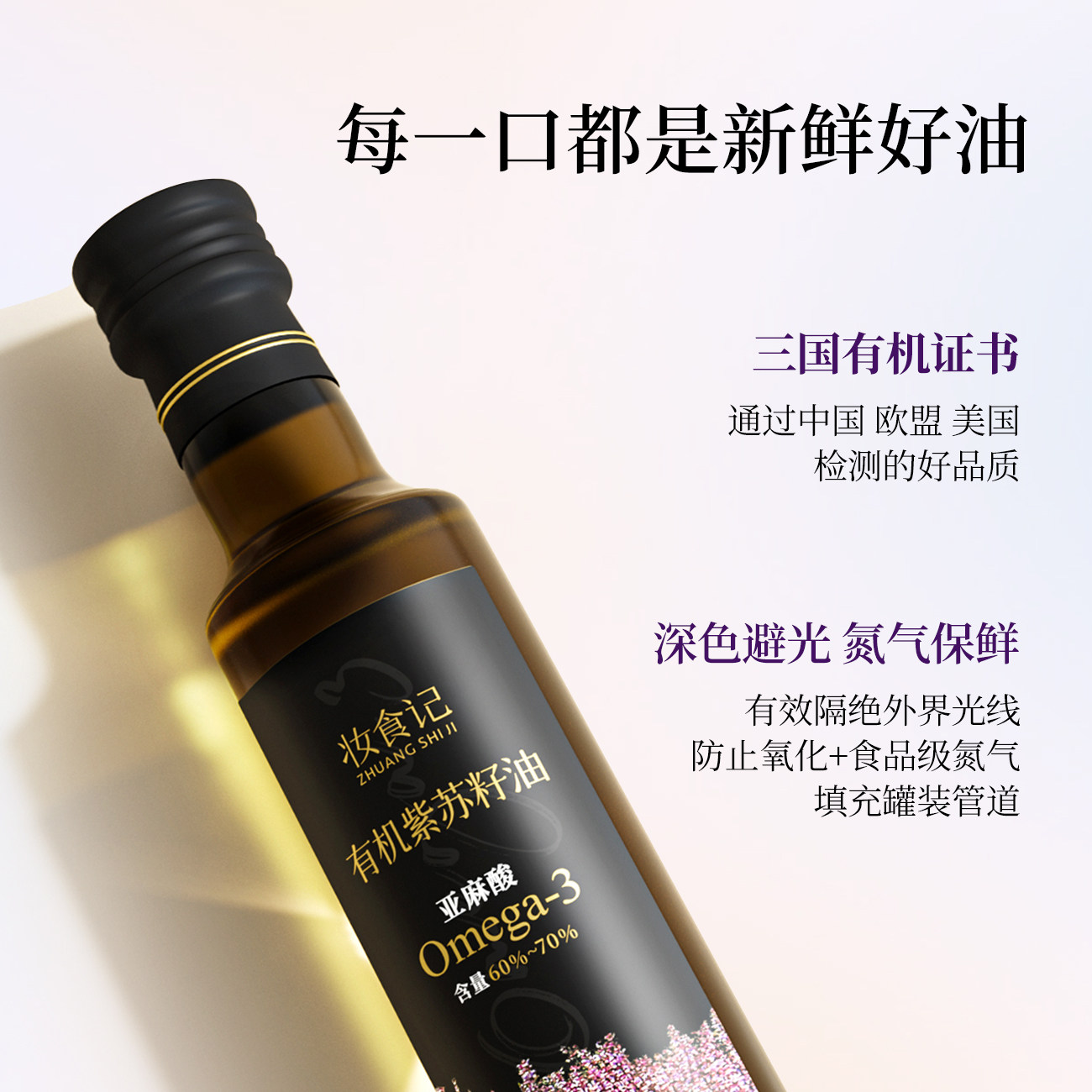 有机食品|酸值适中|正常稳定|标准不皂化物|优秀亚麻酸|低温冷榨